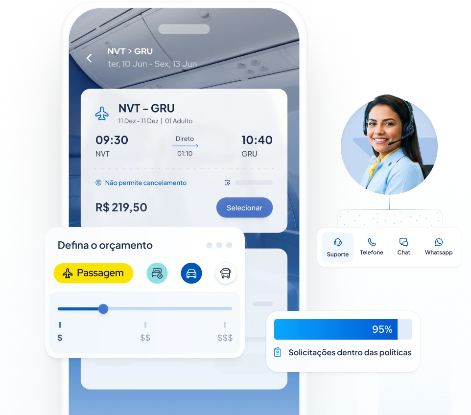 Reserve voos, hotéis em um único fluxo, com políticas aplicadas automaticamente e com uma agência de viagens com atendimento 24/7.